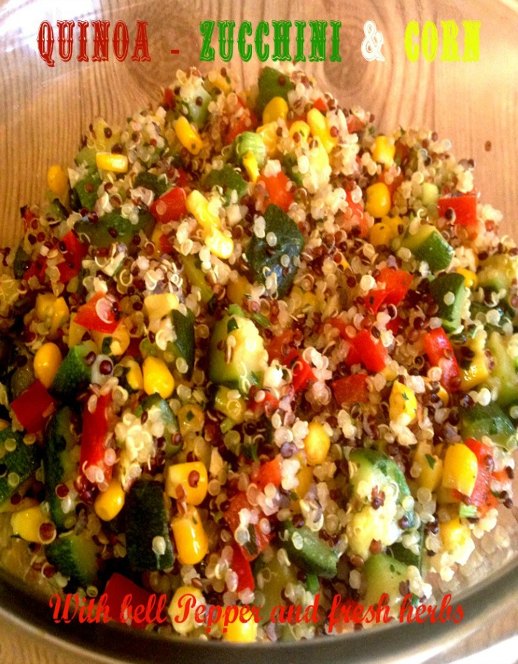 I picked up some zucchini and was wondering what I can make with it that doesn’t constitute anything going into the oven, then remembered I had about a cup of red quinoa in my pantry, then I was thinking I can make mix both together and have a great salad, BORING!, so I searched the refrigerator and got a red bell pepper, found some frozen corn in the freezer and WALLA! a delicious and not a boring salad was born. With some added fresh garlic and some fresh herbs this salad is the bomb.